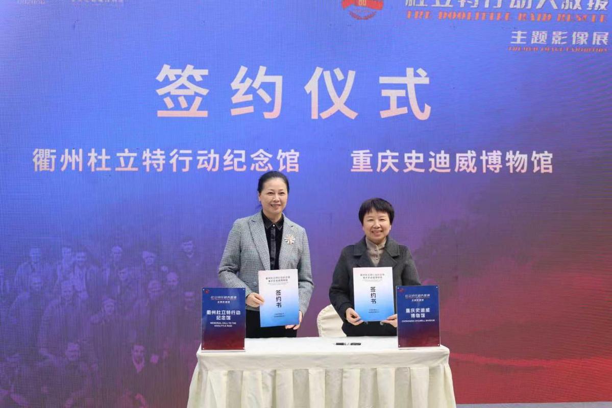 活动现场,重庆史迪威博物馆与衢州杜立特行动纪念馆现场签订了合作协议。衢州市代表还向重庆史迪威博物馆、鹅岭公园管理中心,以及杭州市国防动员教育馆、南京抗日航空烈士纪念馆赠送历史文集《英雄山河—1942年的衢州之约》。