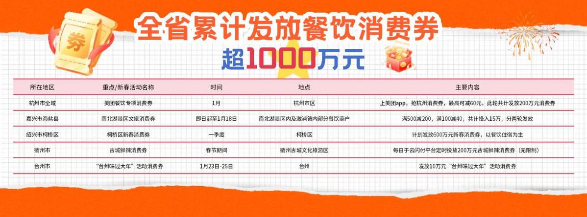 为让市民游客吃得实惠、过得热闹,浙江省各级文旅、商务部门联合企业推出一系列务实惠民举措。据统计,全省共计划发放餐饮专项消费券超过1000万元,覆盖杭州、绍兴、嘉兴、台州、衢州等多地。其中,美团面向杭州全域派发200万餐饮专项消费券,绍兴柯桥区计划发放600万元新春消费券,衢州市派发200万“古城鲜辣”消费券,台州市发放“台州味过大年”主题活动消费券等。