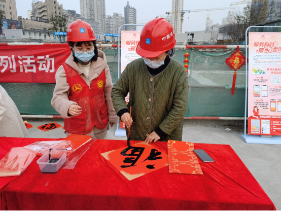 文艺志愿者们还开展了写春联送祝福活动,在场工头人手两幅,让工友们不仅能为宿舍贴春联,也能为远方的家准备一幅春联。