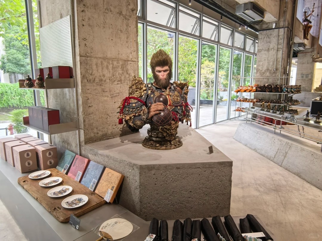 店铺总面积约1000平方米,分为上下两层,采用“展品”与“商品”穿插陈列的方式,使整个空间兼具零售功能与美术馆气质。细微之处亦隐藏诸多游戏彩蛋,待玩家探索发现。除购物功能外,该店更是一个集零售、体验与餐饮于一体的综合文化空间。店内推出多款主题甜品与饮品,契合年轻人喜爱打卡的“小确幸”文化。二楼走廊区域被打造为小型艺术展区,陈列了此前黑神话与中国美术学院艺术展中的部分作品。这种艺术、文化与商业的融合模式,为玩家带来超越普通周边购物的沉浸式体验,也与周边区域浓厚的文艺氛围相呼应。