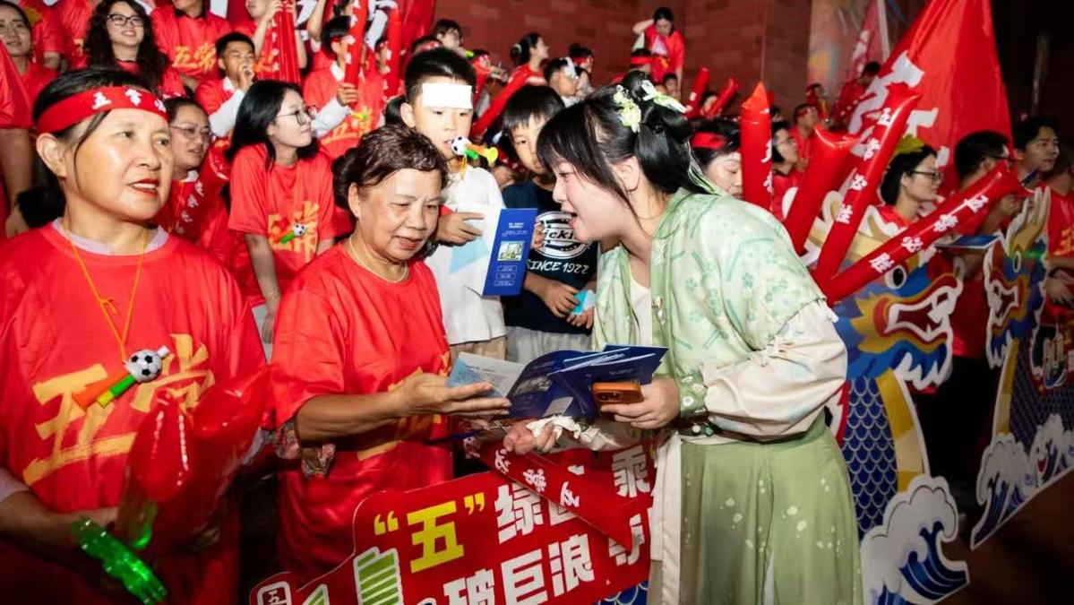 赛场边一道独特的风景线吸引众多目光,洪园社区工作人员身着飘逸的汉服,穿梭在观众席间。她们手中捧着象征“事事如意”的甜美红柿,与观众分享进球的喜悦,同时将一本本“扫黄打非”宣传册送至市民手中。这一创新举动,将体育激情、传统文化与“扫黄打非”宣传巧妙融合,让绿茵场不仅成为竞技的舞台,更化身为弘扬社会文明新风的生动课堂。