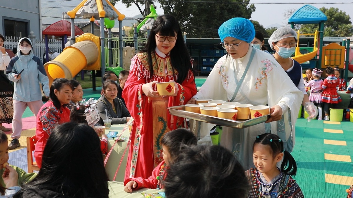 活动尾声,一碗碗冒着热气的长寿面暖胃又暖心,奉化的小朋友们与祖辈围树起舞、领取百家米,欢声笑语萦绕。“和甘洛小朋友连线很新奇,他们都穿着和我不一样但又漂亮的衣服。我还把甜甜的长寿面给奶奶了,希望奶奶以后的生活都甜甜的。”奉化小朋友田语倩用稚嫩的话语说出了全体小朋友的心声。