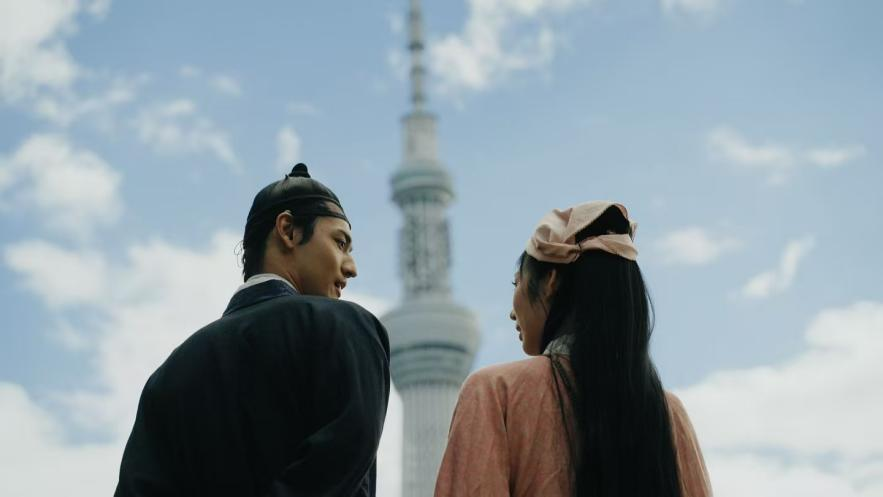快闪活动中,2位年轻演员分别身着《太平年》与《家业》的剧中精美服饰,漫步在东京街头,演绎了一段跨越时空的动人故事。他们身着唐制汉服和明制汉服,打卡了晴空塔、东京塔、银座、涩谷等地标场景,荧幕上的中式古典美学零距离呈现在公众面前,吸引众多市民与国际游客驻足合影赞叹。