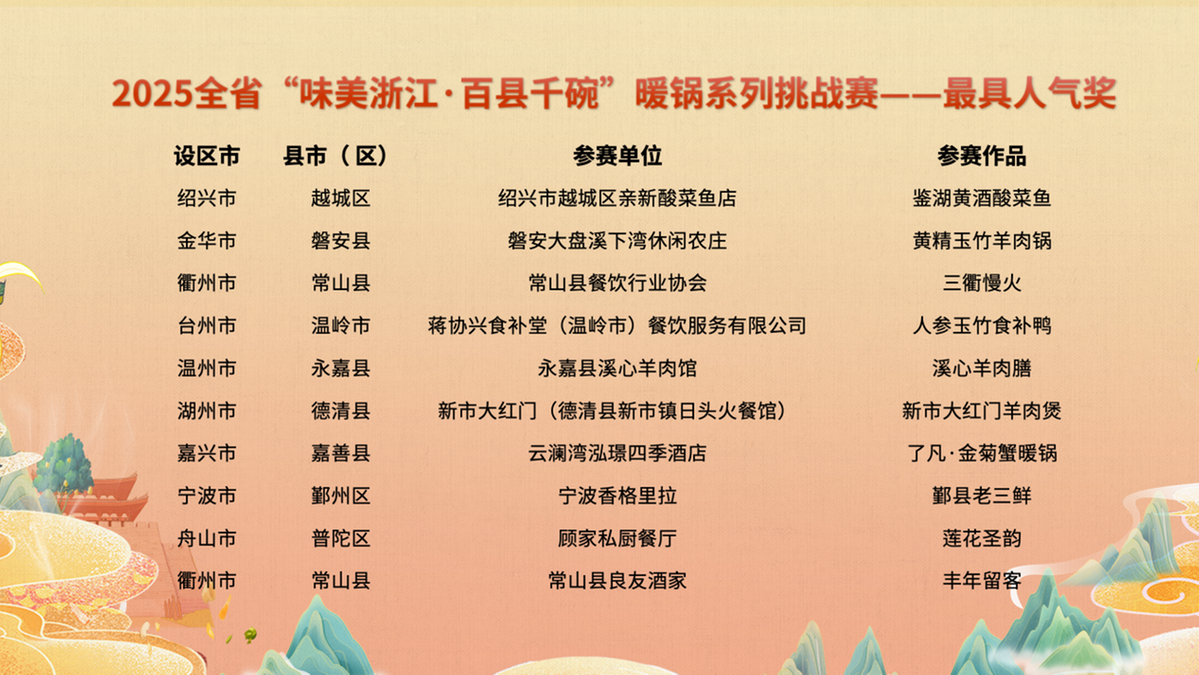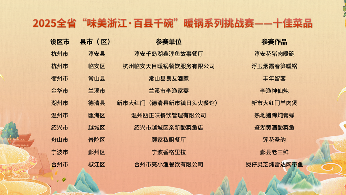 作为活动亮点环节,全省“味美浙江·百县千碗”暖锅系列挑战赛汇聚了来自11个地市的21道精品暖锅。经过专业评审的严格品鉴,十道极具地方特色的暖锅脱颖而出,杭州市淳安县的“淳安花猪肉暖锅”、杭州市临安区的“浮玉烟霞春笋暖锅”、衢州市常山县的“丰年留客”等荣获“十佳暖锅”称号;绍兴市越城区的“鉴湖黄酒酸菜鱼”、金华市磐安县的“黄精玉竹羊肉锅”、衢州市常山县的“三衢慢火”等荣获“最具人气奖”。这些暖锅不仅展现了浙江各地的饮食文化魅力,也成为“味美浙江·百县千碗”走进星级饭店的冬日主打内容。