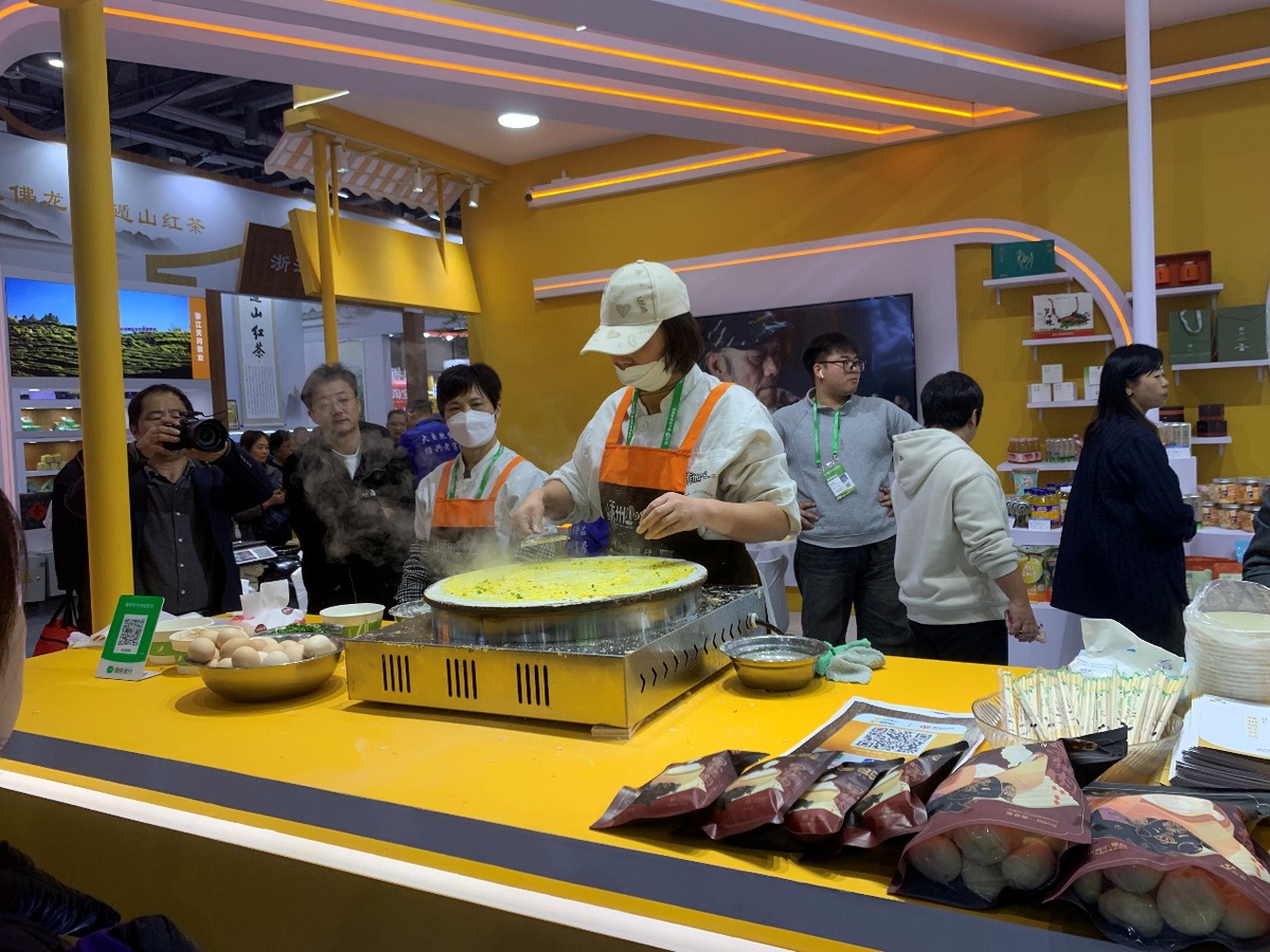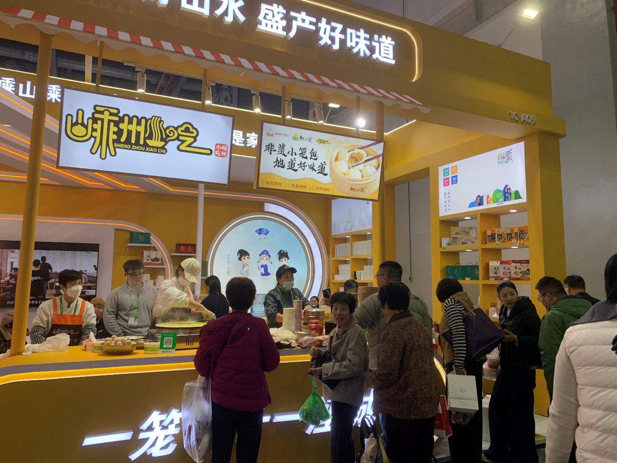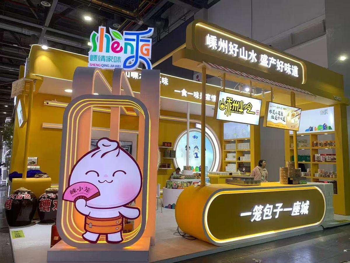 本次嵊州特装馆以嵊州特色小吃为焦点进行整体设计与氛围营造,核心展品包括“嵊情家味”旗下五大参展企业——嵊州市越鲜食品有限公司、嵊州市大自然食品有限公司、嵊州市蒸乐坊小吃馆、嵊州市兴嵊农业发展有限公司及浙江春力茶业有限公司带来的特色产品。其中,嵊州小笼包作为核心吸引力,凭借皮薄馅鲜、汤汁丰盈的独特口感成为展馆“人气王”,吸引大量参观者驻足品尝。此外,嵊州麦镬、糟鸡、糟肉、糟鱼等地方特色面食与腌制食品,以及春力茶业等企业带来的嵊州名茶及茶饮产品,共同构成“嵊州味道”的丰富图谱,协同推介嵊州市其他优质农产品如特色果蔬、粮油等,形成“小吃+全域农产品”的展示矩阵。