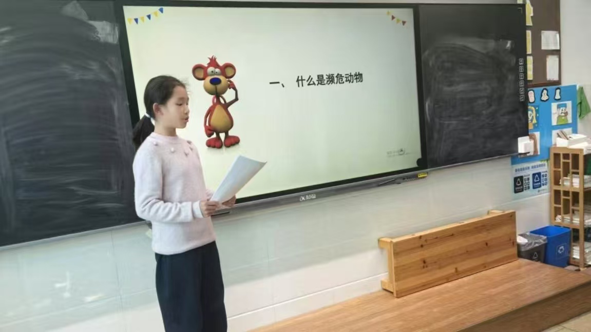 课堂上,四位小主讲人依次登场,沿着“世界—中国—本土”的脉络,生动讲述了普氏野马、山地大猩猩、丹顶鹤、扬子鳄等珍稀动物的生存状况与保护故事。当话题转向家乡的南山省级自然保护区,被称为“盔甲小卫士”的中华穿山甲成为焦点。同学们了解到,这一国家一级保护动物在婺城区南山仍有分布,但生存范围狭窄、数量稀少,从而深刻体会到保护“身边珍稀”的紧迫性与责任感。